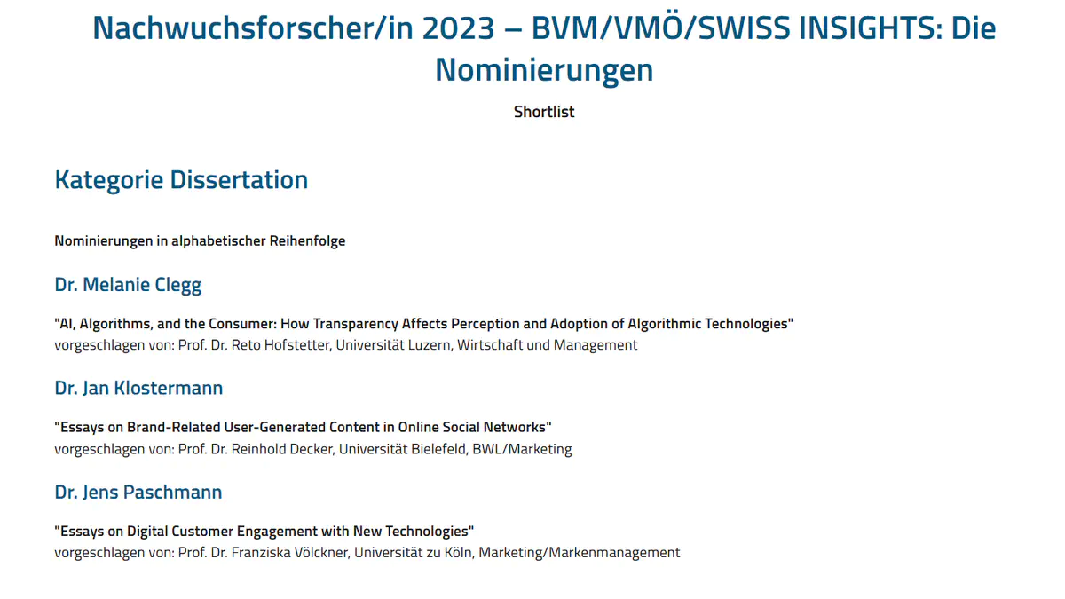 I was finalist for the “Young Researcher 2023” dissertation award of BVM/VMÖ/SWISS INSIGHTS. The Young Researcher Award honors young researchers for outstanding research work in the field of marketing and media.